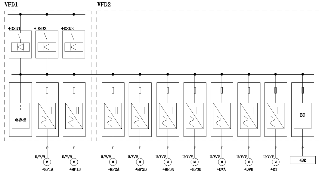 整個(gè)驅(qū)動(dòng)系統(tǒng)使用GD800工程型變頻系列產(chǎn)品,采用二極管整流,共直流母線方案。