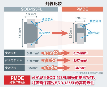 PMDE封裝是ROHM自有的小型封裝,具有與普通SOD-323封裝相同的焊盤圖案。通過改善背面電極和散熱路徑,用更小的封裝尺寸實現(xiàn)了與普通SOD-123FL封裝(3.5mm×1.6mm)同等的電氣特性(電流、耐壓等),并且使安裝面積減少約42%,有助于電路板的小型化。此外,安裝強度約為SOD-123FL封裝的1.4倍,降低了電路板承受應(yīng)力時產(chǎn)生裂紋(產(chǎn)品龜裂)的風(fēng)險,因此安裝可靠性更高。