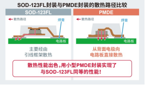 對此,PMDE封裝通過擴大背面電極面積,同時改善了散熱路徑,將經(jīng)由引線框架散熱改為直接散發(fā)到電路板上。這使散熱性能大幅提升,以更小的尺寸(2.5mm×1.3mm)即可實現(xiàn)與普通SOD-123FL封裝(3.5mm×1.6mm)同等的電氣特性,從而可減少約42%的安裝面積,非常適合元器件安裝密度不斷提高的車載應(yīng)用。