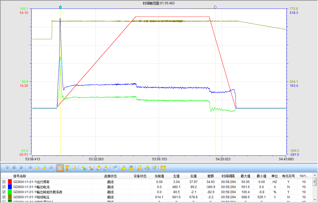 啟動波形:皮帶機空載啟動,從輸出轉矩曲線判斷,皮帶機停止時由于皮帶機存在慣性,電機處于臨界發(fā)電狀態(tài)。