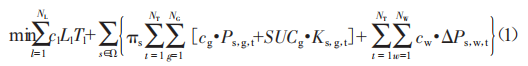 式中,0表示場景+的集合:m+表示場景+發(fā)生的概率:Nw表示線路數量:NT表示總時段數:NL表示發(fā)電機數量:Nw表示風機(光伏)數量:P+,s,g為在場景+中發(fā)電機s在1時刻的出力:AP+,t,g表示在場景+中風機(光伏)t在1時刻的棄風量:cl表示線路投資成本:cs表示發(fā)電機的出力成本:sUCs表示機組s的啟動成本:ct表示風電的棄風(棄光)懲罰成本:K+,s,g表示0-1變量,反映機組的啟動狀態(tài),1表示啟動,0表示未啟動。