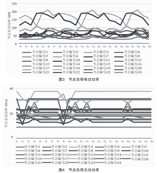 選取典型日各節(jié)點負荷有功、無功功率,如圖3、圖4所示。