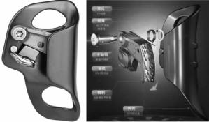 通過外殼與棘刺夾板對繩索形成摩擦力,胸部上升器掛在操作人員的胸部,上升時,棘刺夾板順時針轉(zhuǎn)動一定角度,不產(chǎn)生夾緊及摩擦力,可沿繩索上升,無阻力。當(dāng)胸部上升器向下滑動時,棘刺夾板逆時針轉(zhuǎn)動一定角度,棘刺夾板將繩索夾緊,無法下降,從而使工作人員懸掛在繩索上呈靜止?fàn)顟B(tài)。1.3.2手部上升器及工作原理