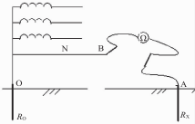 TT系統(tǒng),測量N線與接地裝置A之間的電阻,如圖4所示。由于大地是電容體,采用萬用表測量時使用的是直流電壓,在測量回路中,電容對直流電會產(chǎn)生較大的阻抗,測出的電阻值較大:而采用日本共立4105型接地電阻儀測量時使用的是交流電壓,大地這個電容體對交流電產(chǎn)生的阻抗很小,測出的電阻值基本上是Ro與Rx之和,所以用萬用表測量與用接地電阻儀測量A、B之間的電阻會不同。
