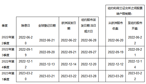 公司監(jiān)事會決定在2022年公司股東大會上提出向股東派發(fā)公司普通流通股每股0.24美元現(xiàn)金分紅方案,在2022年第二、三、四季度和2023年第一季度,向每個分紅季度當(dāng)月在冊股東,分四個季度每季度派發(fā)0.06美元現(xiàn)金分紅,詳見按照下表。