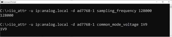 IIO工具是一組與libIIO一起發(fā)布的命令行工具,對(duì)于通過腳本執(zhí)行的低等級(jí)調(diào)試和自動(dòng)化任務(wù)來說非常有用。例如,在執(zhí)行實(shí)驗(yàn)室測(cè)試時(shí),它可以在不同的采樣率模式下設(shè)置平臺(tái),以及收集一些數(shù)據(jù)。利用幾行bash,或通過使用IIO工具的批處理腳本可輕松完成這些操作。圖5顯示了一個(gè)簡單示例,可以在本地或遠(yuǎn)程運(yùn)行,以更改采樣速率和ADC的地輸入模式。這個(gè)示例使用名為iio_attr的IIO工具,讓用戶能夠輕松更新設(shè)備的配置。