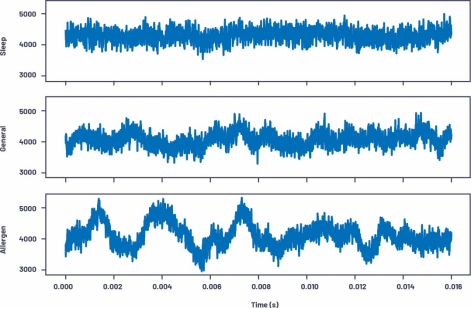 我們?cè)赑ython中看看這種方法。在隨PyADI-IIO提供的一個(gè)示例中,將CN0532安裝到振蕩風(fēng)扇上,然后進(jìn)行了一些測(cè)量。這些測(cè)量在不同的風(fēng)扇設(shè)置(Sleep、General、Allergen)下進(jìn)行,在每種模式下都會(huì)捕捉409,600個(gè)樣本。在圖11中查看這個(gè)數(shù)據(jù)時(shí),可以輕松確定Allergen用例的時(shí)域,但其他兩個(gè)用例則比較難以區(qū)分。雖然可以通過檢測(cè)來確認(rèn)這些用例,但在時(shí)域中使用算法來確認(rèn)這些用例會(huì)很容易出錯(cuò)。