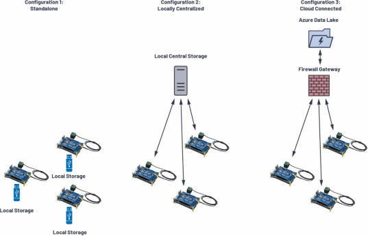 圖15最左側(cè)的配置是脫機(jī)收集數(shù)據(jù)示例,一般發(fā)生在偏遠(yuǎn)位置或無法聯(lián)網(wǎng)的地方。在這種情況下,平臺(tái)會(huì)配備大型存儲(chǔ)媒介,并按照計(jì)劃來收集數(shù)據(jù)?;蛘撸渌麅蓚€(gè)選項(xiàng)是將數(shù)據(jù)流傳輸至同一個(gè)端點(diǎn)。圖15中間的配置是隔離網(wǎng)絡(luò),可能僅供組織內(nèi)部使用,或者是偏遠(yuǎn)位置的一組用于集中收集數(shù)據(jù)的平臺(tái)。出于安全考慮,或者在無法聯(lián)網(wǎng)時(shí),可能需要這種配置。在這些配置下,CN0549易于設(shè)置,且能夠根據(jù)終端部署的特定需求來自定義。