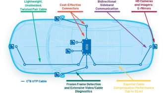 低壓數(shù)字信號(hào)(LVDS)攝像頭鏈路為汽車高清攝像頭提供高性能但成本高昂的解決方案。LVDS是一種數(shù)字串行傳輸方案,可以將視頻從攝像頭準(zhǔn)確地傳輸至電子控制單元(ECU)。LVDS攝像頭解決方案非常適合400-800萬(wàn)像素的高端前置攝像頭。在汽車攝像頭中,前置攝像頭要求最高的視頻分辨率,以支持自適應(yīng)巡航控制、目標(biāo)檢測(cè)、交通標(biāo)志識(shí)別和防撞。LVDS使用高帶寬,要求使用屏蔽電纜,以便通過(guò)汽車EMC和EMI測(cè)試。LVDS鏈路通常使用同軸和微型同軸電纜。這些電纜的彎曲率,以及經(jīng)歷多次彎曲的耐久性,使得這些電纜的制造成為汽車OEM需要面對(duì)的一個(gè)問(wèn)題,例如,需要穿過(guò)門(mén)鉸鏈部署電纜,以便將攝像頭安裝在鏡子上,或安裝在車內(nèi)頂棚上,以實(shí)現(xiàn)乘客狀態(tài)監(jiān)測(cè),或者甚至安裝在前座椅背后以便進(jìn)行視頻會(huì)議。同軸連接器的成本使高清攝像頭連接成本高昂,讓低端和中端車輛望而卻步。
