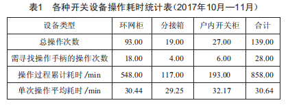 當(dāng)現(xiàn)場(chǎng)已配備完好的開關(guān)操作手柄時(shí),開關(guān)操作耗時(shí)約為0.6min,各種開關(guān)設(shè)備操作耗時(shí)統(tǒng)計(jì)表如表1所示,出現(xiàn)操作手柄遺失或損壞的概率為28/139≈20%,對(duì)于各種類型的開關(guān)設(shè)備,尋找對(duì)應(yīng)型號(hào)的開關(guān)操作手柄的平均耗時(shí)幾乎一致,單次操作平均耗時(shí)為30.64min,尋找操作手柄的過(guò)程平均耗時(shí)約28min,是主要的耗時(shí)原因。