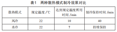 半導體制冷芯片的制冷效果好壞直接影響交換機外置散熱系統(tǒng)的有效性,實驗選用型號為TEC1-12705的半導體制冷片,尺寸為40mm×40mm×3.8mm,額定電壓12V。分別對風冷散熱和水冷散熱兩種散熱模式達到規(guī)定溫度時進行數(shù)據(jù)對比,如表1所示。