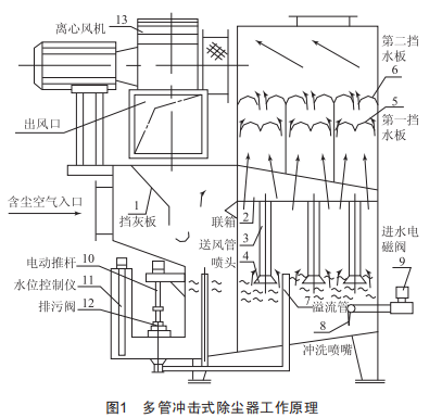 多管沖擊式除塵器工作原理如圖1所示,設備主要由上、下箱體兩大部分組成,上箱體包括擋灰板、聯(lián)箱、進出風管、兩道擋水板、離心風機等:下箱體包括噴淋管、電磁閥、電動推桿、液位控制儀等。