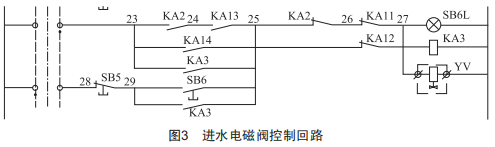 進水電磁閥控制回路如圖3所示,圖中23~29為接線端子編號,除塵器上水流程是電磁閥yV打開,水位到達備用水位時,觸發(fā)KA11動作,KA11的常閉節(jié)點斷開,電磁閥失電,停止注水。導致水箱漫水的原因主要有以下幾種: