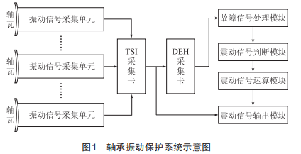 該軸承保護(hù)系統(tǒng)包括Ts1采集卡和DEH采集卡,Ts1采集卡和DEH采集卡信號(hào)連接,Ts1采集卡的輸入端連接有多個(gè)振動(dòng)信號(hào)采集單元,振動(dòng)信號(hào)采集單元固定在軸瓦外壁上,DEH采集卡的輸出端依次連接故障信號(hào)處理模塊、振動(dòng)信號(hào)判斷模塊、振動(dòng)信號(hào)運(yùn)算模塊和振動(dòng)信號(hào)輸出模塊,故障信號(hào)處理模塊接收DEH采集卡輸出的第一信號(hào)并輸出第二信號(hào),第二信號(hào)連接在振動(dòng)信號(hào)判斷模塊的輸入端,振動(dòng)信號(hào)判斷模塊輸出第三信號(hào),并輸入至所述振動(dòng)信號(hào)運(yùn)算模塊中,振動(dòng)信號(hào)運(yùn)算模塊輸出第四信號(hào),并輸入至所述振動(dòng)信號(hào)輸出模塊中,振動(dòng)信號(hào)輸出模塊輸出第五信號(hào),通過(guò)信號(hào)線纜發(fā)送至ETs系統(tǒng)中。軸承振動(dòng)保護(hù)系統(tǒng)示意圖如圖1所示。