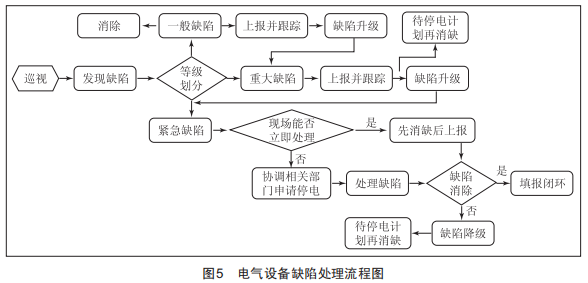 在確定了設(shè)備發(fā)熱的根源后,運(yùn)維人員結(jié)合《帶電設(shè)備紅外診斷應(yīng)用規(guī)范》《廣東電網(wǎng)公司設(shè)備缺陷管理規(guī)定》,根據(jù)電氣設(shè)備管理缺陷等級的定義、劃分及處理的相關(guān)要求,繪制了電氣設(shè)備消缺流程圖,如圖5所示。