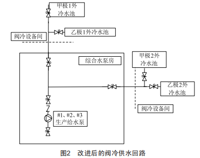 建議更改給水管道設(shè)計,使生產(chǎn)水泵出水經(jīng)不同的管道分別給4個極補水。但由于土建工程已完工,再從水泵房敷設(shè)管道至閥冷設(shè)備間工程量較大,因此可在各極的閥冷設(shè)備間生產(chǎn)給水管道處增加手動閥門,使4個極的外冷補水相對獨立,如圖2所示。這樣雖然兩個極在水泵房到閥冷設(shè)備間仍共用管道,但從閥冷設(shè)備間到外冷水池這一段管道已相互獨立。
