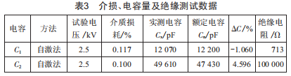 采用自激法測量顯示C1、C2介損均符合規(guī)范0.25%的要求,而電容量測試C1的電容變化百分比符合規(guī)范±2%的要求,C2的電容變化百分比為4.596%則超出了標準。