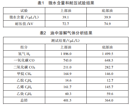 對CVT電容單元進行了油取樣分析,發(fā)現(xiàn)油樣油色是黃褐色,可聞到濃烈的燒焦味。經(jīng)對油樣微水含量、耐壓試驗和油色譜分析發(fā)現(xiàn),油中微水含量超標,電容器內(nèi)部總烴、乙炔、氫氣均嚴重超標,數(shù)據(jù)如表1、表2所示,電容器內(nèi)部發(fā)生高能放電,油中氫氣、乙烷、乙烯含量占主要成分。