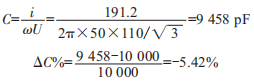 現(xiàn)場測試末屏電流N端為:i=191.2A。通過公式現(xiàn)場計算可以得出電容量為: