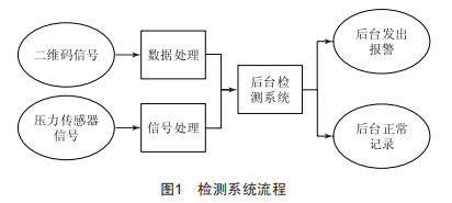 檢測系統(tǒng)流程如圖1所示,二維碼信號經(jīng)過相應的數(shù)據(jù)處理,將其傳送到后臺檢測系統(tǒng):同樣,壓力傳感器經(jīng)過信號處理系統(tǒng)將信號傳送至后臺檢測系統(tǒng)。當系統(tǒng)在特定時間內檢測到壓力傳感器信號時,即刻在后臺進行記錄和存儲,否則系統(tǒng)將自動發(fā)出警報,以此告知相應的操作人員。