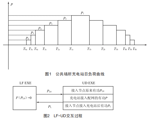 PSASP設(shè)計了用戶自定義建模方法,即用戶自定義模型模塊(UD),利用UD根據(jù)三類充電站的日負荷曲線分別建立動態(tài)負荷模型后,可以根據(jù)需要將模型接入PSASP中的電力系統(tǒng)以進行潮流、暫穩(wěn)等計算,潮流模塊(LF)與用戶自定義模型模塊(UD)的交互過程如圖2所示。圖2中,PL0為接入充電站模型節(jié)點原來所帶的有功負荷:PL為節(jié)點接入充電站模型后所帶的有功負荷。