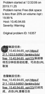 觸發(fā)器被觸發(fā)后,調(diào)用短信模塊將告警信息發(fā)送給接收者,同時利用Curl工具調(diào)用Jenkins中已經(jīng)配置好的預(yù)案。