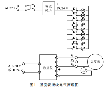 對(duì)溫度表進(jìn)行外觀檢查后,進(jìn)行溫度示值誤差校驗(yàn)。首先將溫度表按照電氣原理圖完成外部接線,檢查溫度表、數(shù)顯儀、測(cè)控裝置的量程是否一致,將標(biāo)準(zhǔn)溫度計(jì)和被檢溫度表裝置的感溫裝置垂直插入恒溫裝置中,恒溫裝置恒定溫度偏離檢定點(diǎn)不超過(guò)0.2℃。在溫度計(jì)全量程范圍內(nèi)選擇8~10個(gè)校驗(yàn)點(diǎn)進(jìn)行校驗(yàn),感溫裝置在恒溫槽中要穩(wěn)定5min后方可讀數(shù),核對(duì)標(biāo)準(zhǔn)溫度計(jì)、機(jī)械指示、數(shù)顯儀顯示和輸出電流。溫度表接線電氣原理如圖1所示。