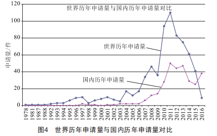 電動汽車電池均衡技術國內歷年專利申請量分布如圖3所示,世界歷年申請量與國內歷年申請量對比如圖4所示,由圖4可以看出,與國外專利申請趨勢大致對應,國內專利申請可以大致分為兩個階段:第一階段為1978一2006年,第二階段為2006年至今。