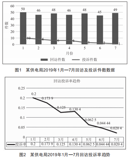 圖1展現(xiàn)了某供電局2019年1月一7月回訪及投訴件數(shù)的數(shù)據(jù),統(tǒng)計(jì)后我們發(fā)現(xiàn),在每月回訪數(shù)接近的情況下,在經(jīng)過培訓(xùn)與激勵(lì)后,投訴或不滿的客戶件數(shù)逐步下降,說明電力營銷人員的客戶滿意度在逐步提升,在7月已降至僅有1個(gè)投訴/不滿意件。