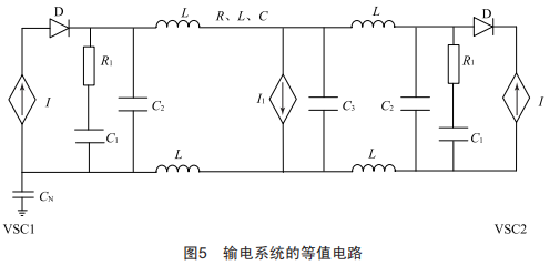 以圖m所示的等值電路簡化表示整個輸電網(wǎng)絡(luò)。當換流器端電壓加在線路上時,直流輸電線路將不斷充電而產(chǎn)生過電壓,并在線路上發(fā)生傳遞。直流線路端部電壓在末端開路時將大幅升高,流過換流閥的電流在換流閥不能正向?qū)〞r減小為1,換流器處于閉鎖狀態(tài)。在換流閥閉鎖前,圖m所示的VsC1換流站的母線電壓額定值變?yōu)殚]鎖后的線路首端電壓,電壓突變將會引起線路發(fā)生高頻振蕩。