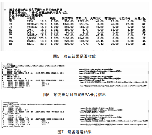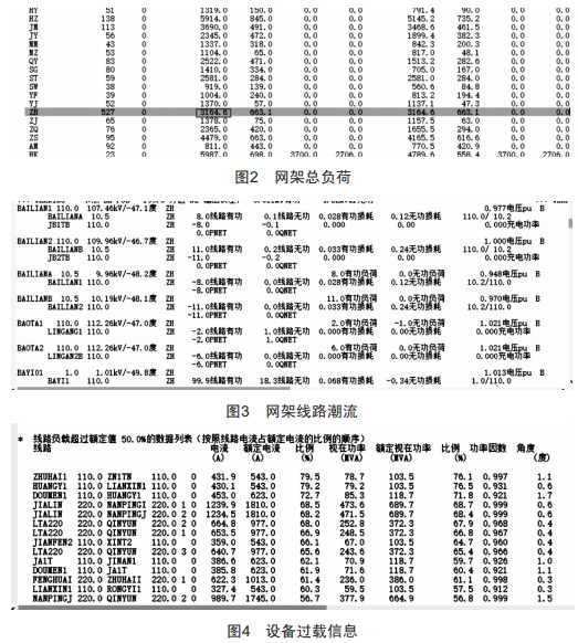 (1)設(shè)備故障前對(duì)DAT網(wǎng)架文件進(jìn)行潮流計(jì)算:計(jì)算出網(wǎng)架的總負(fù)荷、線路潮流、設(shè)備過(guò)載信息、計(jì)算結(jié)果是否收斂,分別如圖2、圖3、圖4、圖5所示。某變電站對(duì)應(yīng)的BPA卡片信息如圖6所示。