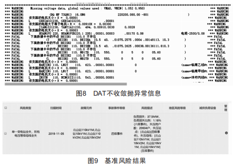 (3)判斷DAT網(wǎng)架文件是否收斂,不收斂則調(diào)用治愈程序,直到DAT網(wǎng)架文件收斂,重復(fù)步驟(2)。導(dǎo)致潮流結(jié)果不收斂的原因是:該變電站的全部母線被退運(yùn)后,關(guān)聯(lián)的主變、線路也要被退運(yùn)。DAT不收斂結(jié)果導(dǎo)致PsD-BPA電力系統(tǒng)分析程序拋異常信息,如圖8所示。