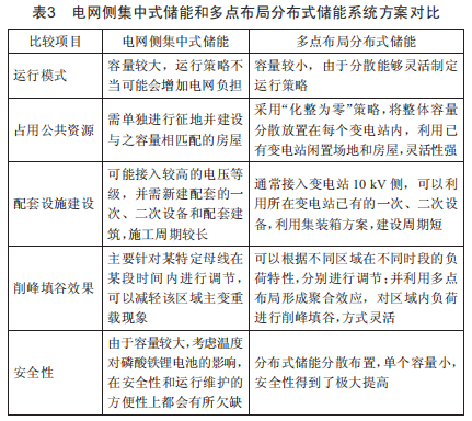 針對(duì)主變重載現(xiàn)象,作為削峰填谷方式的電網(wǎng)側(cè)儲(chǔ)能電站可以采用兩種方案:(1)電網(wǎng)側(cè)集中式儲(chǔ)能調(diào)峰電站:(2)電網(wǎng)側(cè)多點(diǎn)布局分布式儲(chǔ)能系統(tǒng)集群控制調(diào)峰電站。兩種方案的對(duì)比分析如表3所示。