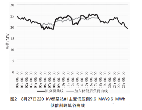 選取220kV都某站#1主變低壓側(cè)2019年8月份最小負(fù)荷日8月27日負(fù)荷數(shù)據(jù)進(jìn)行分析,采用多點(diǎn)布局分布式2個(gè)單元9.6Mw/9.6Mwh對(duì)都某站#1變10kV側(cè)進(jìn)行充放電模擬分析,分別取04:00一07:30進(jìn)行充電,09:00一11:45進(jìn)行放電,12:00一13:30進(jìn)行充電,14:00一17:00進(jìn)行放電,且2次充放電都達(dá)到額定容量,如圖2所示。由圖2可知,加入儲(chǔ)能后,220kV都某站#1主變低壓側(cè)負(fù)荷曲線明顯平緩,削峰填谷效果良好。