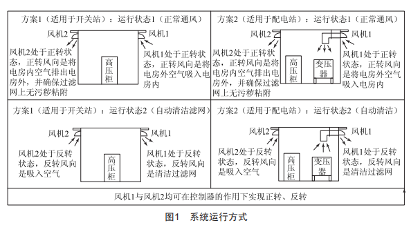 配電房循環(huán)除塵裝置的設計方案為:在配電房設置4處(視配電房具體構造而定)通風點,分別安裝上大功率風機,風機的外邊設置有不銹鋼通過管道,管道截面安裝有孔徑合適的過濾網,通風機在溫控箱及繼電器的控制下可以正常通風并過濾外部飛絮及灰塵。通風機在溫控箱的控制下可以反轉通風,在反轉工況下可以自動清掃過濾網上的灰塵及飛絮,達到自動清潔的效果。