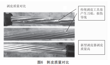 利用傳統(tǒng)工具剝皮易產生刀痕,損傷導線:使用新型電動剝皮器剝皮后導線表面完好,無損傷,剝皮質量高。剝皮質量對比如圖6所示。