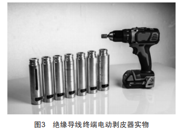絕緣導線終端電動剝皮器實物如圖3所示,機械部分與電動部分搭配,產品操作輕便快捷,簡單省力,不損傷導線,適用范圍廣,根據不同導線線徑,設計了適用于35~240cm2線徑的刀頭套筒,技術先進。