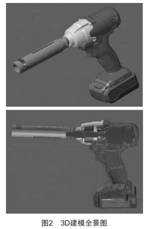 為了解決傳統(tǒng)絕緣導線剝皮器存在的問題,筆者所在研發(fā)團隊經過3個月的討論、設計、建模、選材、加工、調試,自主研發(fā)出了一種新型絕緣導線終端電動剝皮器,其包括手持操作部、套筒及安裝在手持操作部中的電機,該電機的輸出軸與套筒的一端適配傳動連接,該套筒的另一端部表面開設有出屑孔,并于該出屑孔處固定安裝刀片,該刀片用于切削絕緣導線的絕緣層,該套筒的內徑與該絕緣導線的外徑相適應。該剝皮器具有剝皮過程自動化、省力、快速、剝皮效率高、剝皮質量好等優(yōu)勢。該新型剝皮器CAD設計如圖1所示,其3D建模全景如圖2所示。