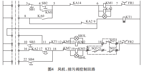 風(fēng)機(jī)、排污閥控制回路如圖4所示,圖中3~22為接線端子編號(hào),KA14為基本水位繼電器常閉節(jié)點(diǎn),除塵器長(zhǎng)時(shí)間處于停運(yùn)狀態(tài)并且排污閥存在漏水現(xiàn)象,水箱內(nèi)部大部分水流失。遠(yuǎn)程啟動(dòng)風(fēng)機(jī)時(shí),負(fù)壓對(duì)水箱水位造成波動(dòng),使基本水位信號(hào)消失,KA14斷開(kāi),風(fēng)機(jī)停運(yùn)聯(lián)鎖排污閥打開(kāi),同時(shí)進(jìn)水電磁閥動(dòng)作,KT1計(jì)時(shí)時(shí)間到后排污閥關(guān)閉。關(guān)閉到位,進(jìn)水電磁閥保持進(jìn)水,基本水位信號(hào)亮起,KA14閉合,風(fēng)機(jī)啟動(dòng),造成基本水位信號(hào)消失。之后不斷循環(huán)以上步驟,浪費(fèi)大量水源及影響設(shè)備正常運(yùn)行,需要及時(shí)對(duì)排污閥漏水問(wèn)題進(jìn)行處理。