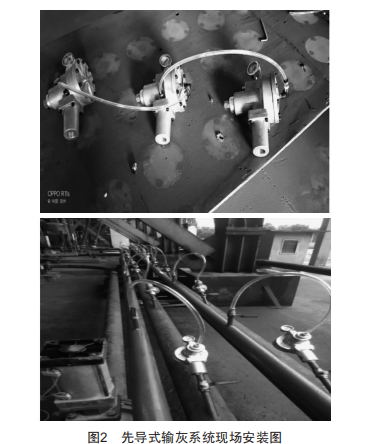 (5)本系統(tǒng)的工作原理好比接力賽,前一個成栓閥負責(zé)把輸送介質(zhì)傳遞給后面一個成栓閥,通過先導(dǎo)式輸灰系統(tǒng)工作原理(圖1)可知,先導(dǎo)式輸灰系統(tǒng)的作用猶如一個推車,進行推拉模式,更有利于輸送,且輸送要求氣源壓力更低,好比汽車,原來二驅(qū),加入先導(dǎo)系統(tǒng)后成了四驅(qū)。先導(dǎo)式輸灰系統(tǒng)現(xiàn)場安裝如圖2所示。