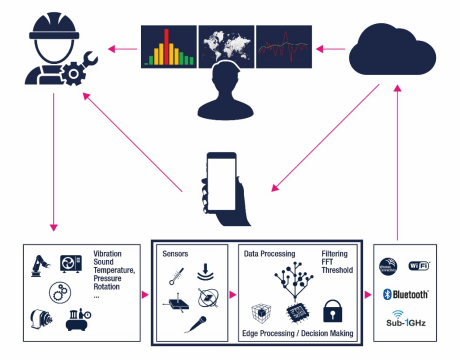 圖 1所示是一個(gè)典型的預(yù)測(cè)性維護(hù)應(yīng)用示意圖,其中,傳感器檢測(cè)設(shè)備產(chǎn)生的信息并將數(shù)據(jù)傳給主控制器。在工業(yè)3.0 中,描述機(jī)器狀況的原始傳感器數(shù)據(jù)直接傳輸給操作員,不涉及任何本地處理或決策任務(wù)。在工業(yè) 4.0 中,主控制器在本地處理傳感數(shù)據(jù),在本地做出決策。如果發(fā)送條件沒(méi)有滿(mǎn)足特定的通知標(biāo)準(zhǔn),主控制器允許無(wú)線連接模塊部分睡眠。操作員僅在收到云端的通知消息后才開(kāi)始介入。這種方法減少了傳輸?shù)皆贫说臄?shù)據(jù)量,降低了本地傳感器節(jié)點(diǎn)的功耗。