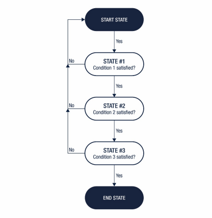 狀態(tài)機(jī)是用于設(shè)計(jì)邏輯連接的數(shù)學(xué)抽象方法(圖 10)。FSM 是一種由預(yù)定數(shù)量的狀態(tài)和狀態(tài)之間的轉(zhuǎn)換組成的行為模型,類(lèi)似于流程圖。傳感器可以設(shè)為用戶(hù)定義模式一旦滿(mǎn)足,就立即生成決策標(biāo)志。為了便于實(shí)現(xiàn)決策功能,意法半導(dǎo)體有些傳感器嵌入了16 狀態(tài)機(jī)。