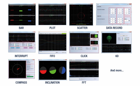 意法半導(dǎo)體等傳感器廠商提供免寫(xiě)軟件的評(píng)估套件(圖 6)。這些小主板,例如,STEVAL-MKI109V3,具有插接傳感器板卡的插座。設(shè)計(jì)人員可以選擇把喜歡的傳感器板卡插到主板上。有些廠商還提供用于控制傳感器的圖形用戶(hù)界面 (GUI)軟件。這些GUI軟件可以存取傳感器的全部寄存器,配置和檢索數(shù)據(jù),不用寫(xiě)代碼,并提供實(shí)用的數(shù)據(jù)處理運(yùn)算功能,例如,傅里葉變換FFT 就是其中的一個(gè)功能(圖 7)。