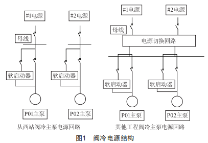 圖1右側(cè)電源回路為廣州局其他直流輸電工程閥冷系統(tǒng)主泵電源結(jié)構(gòu)的主流形式,兩路電源經(jīng)電源切換回路給母線供電,兩臺主泵同時接在該條母線上,這樣當(dāng)一路進(jìn)線電源在出現(xiàn)掉電、缺相等故障情況時能自動切換到另一路電源,保證一次回路不間斷供電,即使出現(xiàn)一路電源丟失同時另一臺主泵故障的情況,也能保證主泵正常切換運(yùn)行,不會造成直流閉鎖。