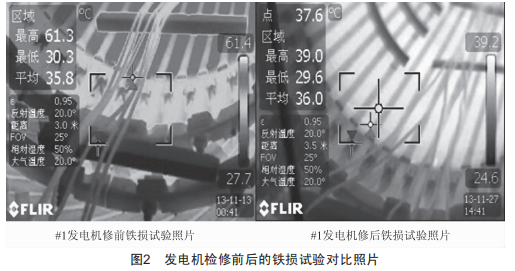 2013年,#1發(fā)電機(jī)鐵損試驗(yàn)時(shí),紅外成像檢測(cè)到#1發(fā)電機(jī)汽端鐵芯有一點(diǎn)發(fā)熱量,較其他部位溫度高,通過(guò)扶直鐵芯硅鋼片,在硅鋼片間墊云母片,再次試驗(yàn)檢測(cè)發(fā)現(xiàn),與其他部位溫度基本一致,解決了#1發(fā)電機(jī)鐵芯發(fā)熱隱患,保證了發(fā)電機(jī)安全穩(wěn)定運(yùn)行,如圖2所示。