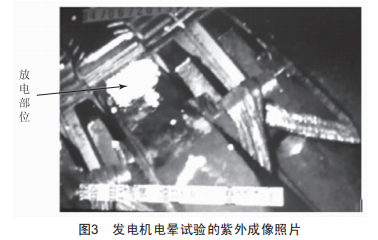 2015年2月,#2發(fā)電機(jī)交流耐壓試驗(yàn)時(shí),A相升壓到17kV后,汽側(cè)端部電暈放電聲音較大,升壓至22kV后,放電聲音增大,伴有放電現(xiàn)象。通過(guò)紫外成像儀檢測(cè)結(jié)果如圖3所示,原因分析:發(fā)電機(jī)定子線棒防電暈層存在斷裂現(xiàn)象,進(jìn)行交流耐壓試驗(yàn)時(shí),存在放電現(xiàn)象,經(jīng)專家確認(rèn)重新涂刷了低阻漆及絕緣漆烘干后,電暈試驗(yàn)合格,耐壓試驗(yàn)合格。