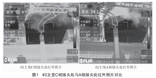 2014年4月6日,#2機(jī)組臨修,拆除#2機(jī)組主變高壓套管接頭發(fā)現(xiàn),C相套管接頭與架空線接頭接觸面不平,接觸不良。緊急對(duì)其進(jìn)行了接觸面修整并鍍銀,重新恢復(fù)后接觸良好。4月8日,#2機(jī)組并網(wǎng),#2機(jī)組負(fù)荷458Mw,測(cè)量#2機(jī)組主變高壓套管接頭處溫度約為26.3℃,與其他兩相基本一致。至此確認(rèn)#2主變高壓套管C相接頭隱患消除。