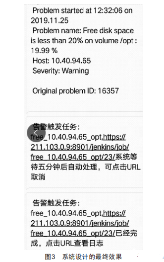 在Zabbix收集到的數(shù)據(jù)經過服務器處理后,如果達到了觸發(fā)器條件,則會首先發(fā)送告警短信給運維人員,然后調用Jenkins中的預置任務進行處理。Jenkins再次發(fā)送確認短信,如果無人操作,則繼續(xù)工作,完成任務并發(fā)送結束告知短信。系統(tǒng)設計的最終效果如圖3所示。