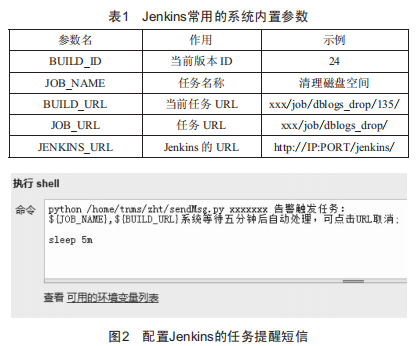 利用這些內置參數(shù),可以構建短信模板:如"xxxx告警觸發(fā)任務:s(JoBNAME},s(BUILDURL},讓系統(tǒng)等待5min后自動處理,可通過點擊URL查看或取消",系統(tǒng)等待功能可通過sleep命令實現(xiàn),最終配置如圖2所示。