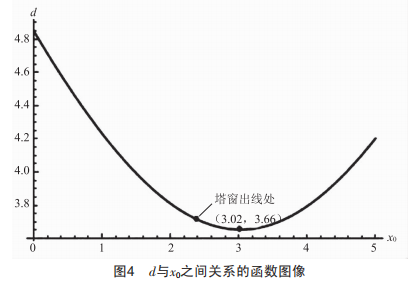 d與x0之間的關(guān)系如圖4所示,分析圖像可知,導(dǎo)線離開塔窗后與塔身的距離先減小后增大,導(dǎo)線與鐵塔最近點(diǎn)并不在塔窗出線處而是在導(dǎo)線離開塔窗后。出現(xiàn)這一情況是因?yàn)閷?dǎo)線離開塔窗的一小段距離內(nèi),由于與臨塔高差大,下壓嚴(yán)重,垂直方向距離增加的幅度大于水平方向,因此導(dǎo)線與塔身距離越來越小,到達(dá)極值點(diǎn)后由于水平方向距離增加的幅度大于垂直方向,導(dǎo)線逐漸遠(yuǎn)離桿塔,因此距離增大。極小值點(diǎn)坐標(biāo)為(3.02,3.66),鐵塔瓶口電氣間隙為3.66m,小于帶電檢修工況所需滿足的3.7m電氣間隙。因此,用空間幾何算法校驗(yàn)鐵塔瓶口電氣間隙的結(jié)論為間隙不滿足要求。